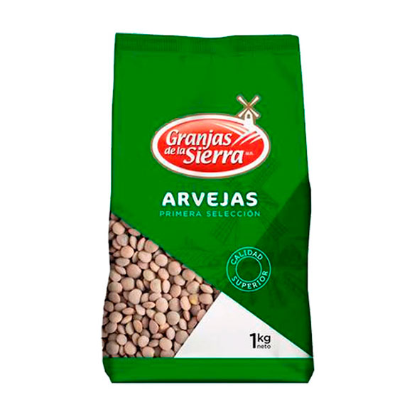 Arvejas verdes partidas, envase de 1 kilo, marca Granjas de la Sierra.