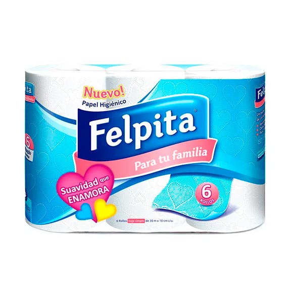 Papel higiénico suave de hoja simple, envase de 6 rollos de 30m x 10cm cada uno, marca Felpita